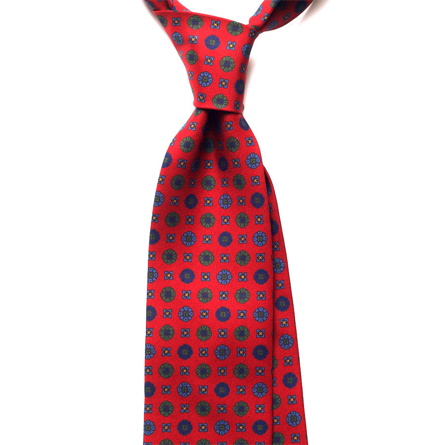 Introducing our latest addition to our collection, a stunning ancient madder silk tie with a beautiful vintage medallion design. Handcrafted in Bucharest, this tie boasts a lightweight three-fold construction with hand-rolled edges, making it the perfect accessory for any season. The silk is hand-printed in a small town in England, using a laborious process that has been unchanged for decades. No other printing method produces such deep and beautiful colors. Add a touch of elegance to any outfit with this one-of-a-kind handcrafted silk tie.