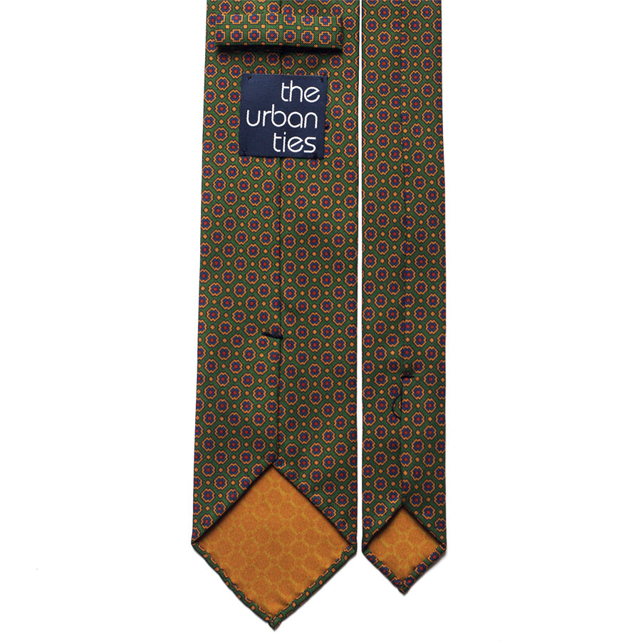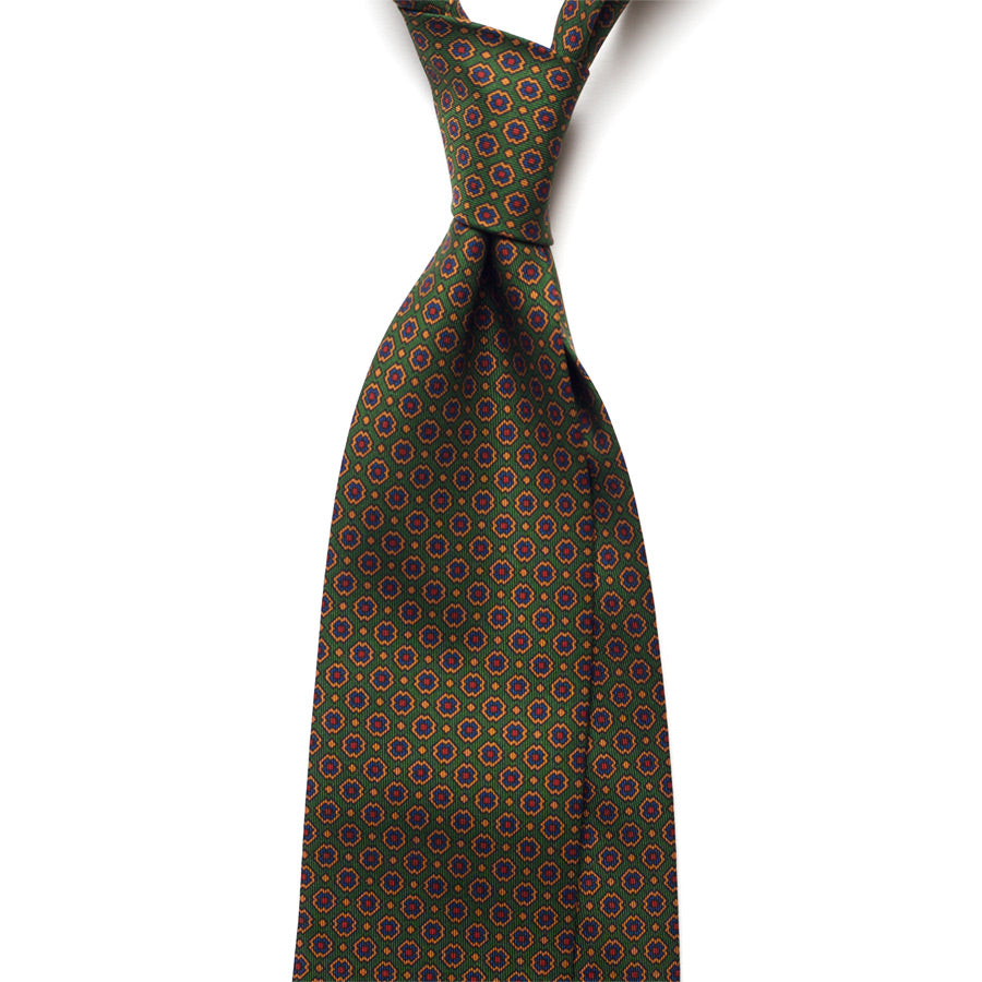 Introducing our latest addition to our collection, a stunning ancient madder silk tie with a beautiful vintage medallion design. Handcrafted in Bucharest, this tie boasts a lightweight three-fold construction with hand-rolled edges, making it the perfect accessory for any season. The silk is hand-printed in a small town in England, using a laborious process that has been unchanged for decades. No other printing method produces such deep and beautiful colors. Add a touch of elegance to any outfit with this one-of-a-kind handcrafted silk tie.