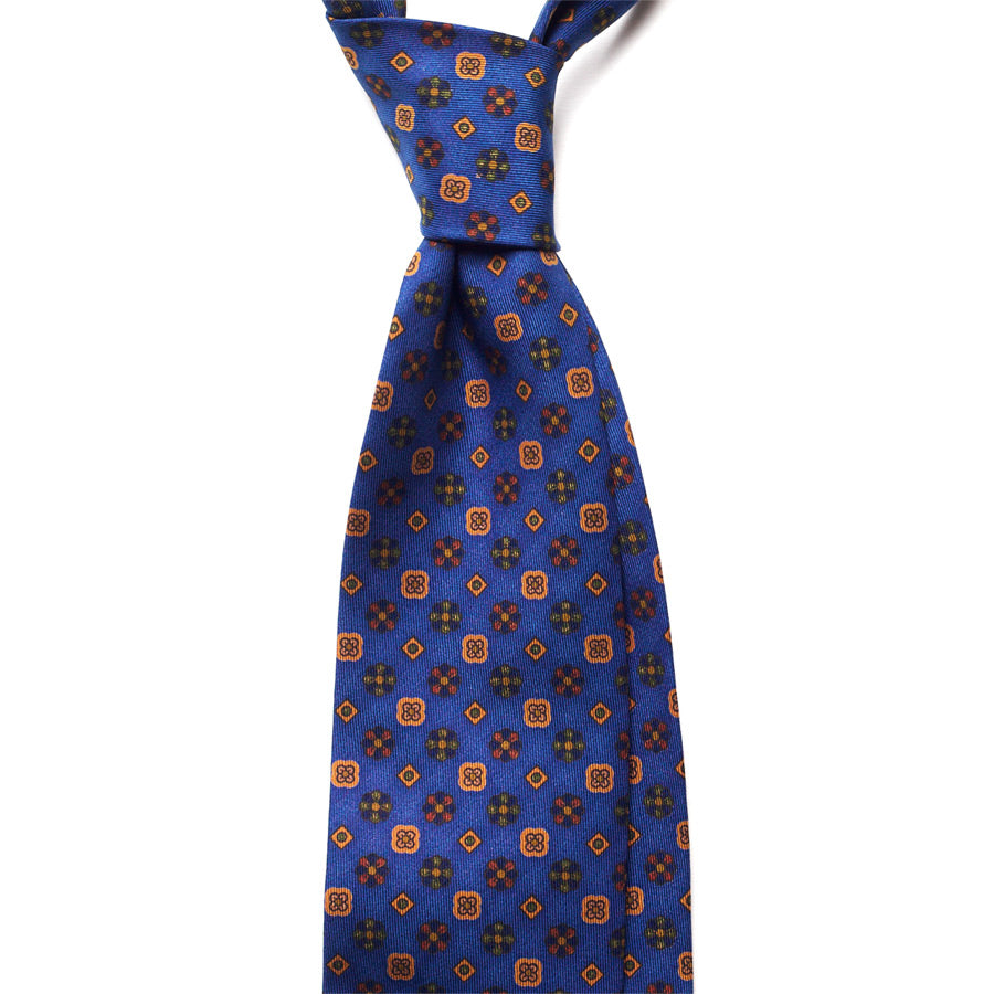 Introducing our latest addition to our collection, a stunning ancient madder silk tie with a beautiful vintage medallion design. Handcrafted in Bucharest, this tie boasts a lightweight three-fold construction with hand-rolled edges, making it the perfect accessory for any season. The silk is hand-printed in a small town in England, using a laborious process that has been unchanged for decades. No other printing method produces such deep and beautiful colors. Add a touch of elegance to any outfit with this one-of-a-kind handcrafted silk tie.