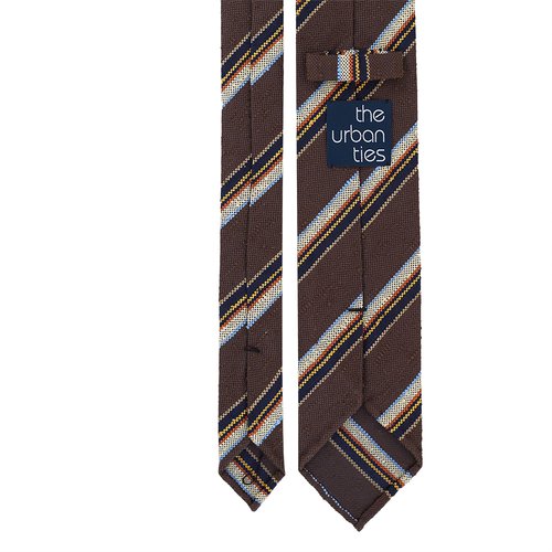 Introducing our latest addition to our collection, a stunning repp stripe shantung silk tie in brown. 100% shantung silk. Handcrafted in Bucharest, this tie boasts a lightweight three-fold construction with handrolled edges, making it the perfect accessory for any season. The silk used in this tie is sourced from the renowned Como region in Italy, known for its centuries-old silk manufacturing tradition. The family-run weavers of this region are renowned for their superb silk quality and beautiful designs, which serve as inspiration for our own creations. Add a touch of elegance to any outfit with this one-of-a-kind handcrafted silk tie.