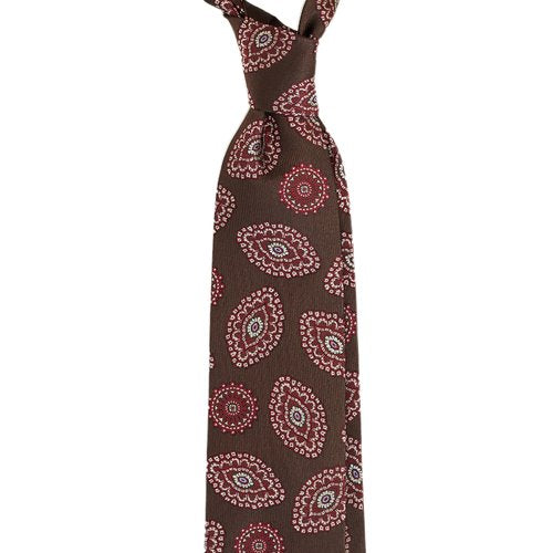 Introducing our latest addition to our collection, a stunning vintage medallion jacquard silk tie in brown. Handcrafted in Bucharest, this tie boasts a lightweight three-fold construction with handrolled edges, making it the perfect accessory for any season. The silk used in this tie is sourced from the renowned Como region in Italy, known for its centuries-old silk manufacturing tradition. The family-run weavers of this region are renowned for their superb silk quality and beautiful designs, which serve as inspiration for our own creations. Add a touch of elegance to any outfit with this one-of-a-kind handcrafted silk tie.